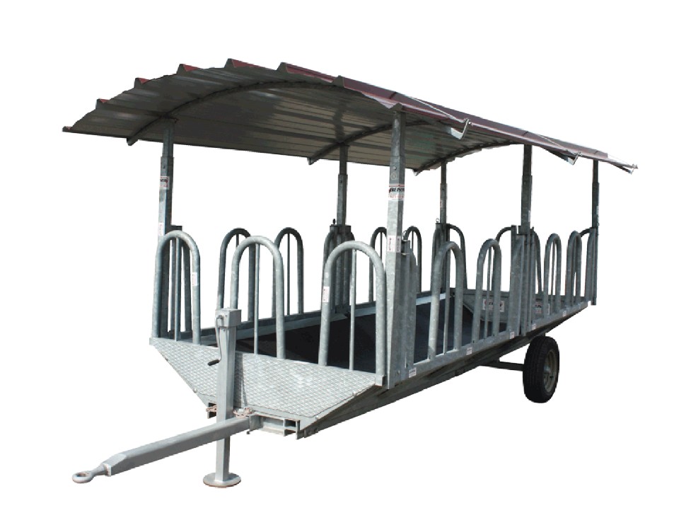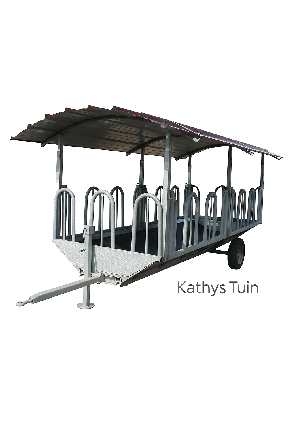 Hooiruif met bogen, 20 voerplaatsen, op wielen en volledig gegalvaniseerd met verstelbaar golfplaten dak. Voorzien van een waterdichte rubbermat van 10 mm, geschikt voor hooi, kuilvoer en granulaat. Achterdeuren volledig openend, toegang aan beide zijden. Stevig, praktisch en duurzaam