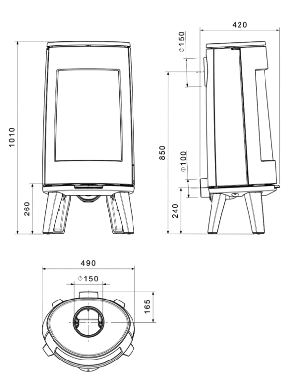 Belangrijkste technische kenmerken: gewicht 130 kg, afmetingen 490 x 1010 x 420 mm, rookafvoer 150 mm (boven/achter), maximale houtlengte 35 cm, verwarmingsoppervlak tot 140 m³, energieklasse A+, 10 jaar garantie. Verkrijgbaar in matzwart, zuiver wit of grijs email.