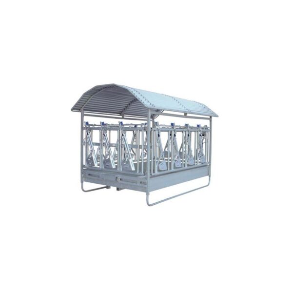 Autosluitende hooiruif voor ronde balen in verzinkt staal, met dak, bodem en verstelbare sledes. Voorzien van een deur en anti-verspillingssysteem.