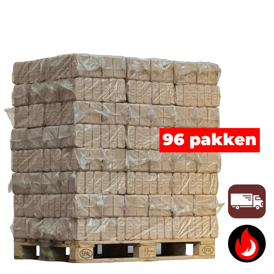 De pallet bevat 96 pakken RUF beuken briketten, netjes verpakt en direct klaar voor gebruik. Gratis thuislevering inbegrepen.